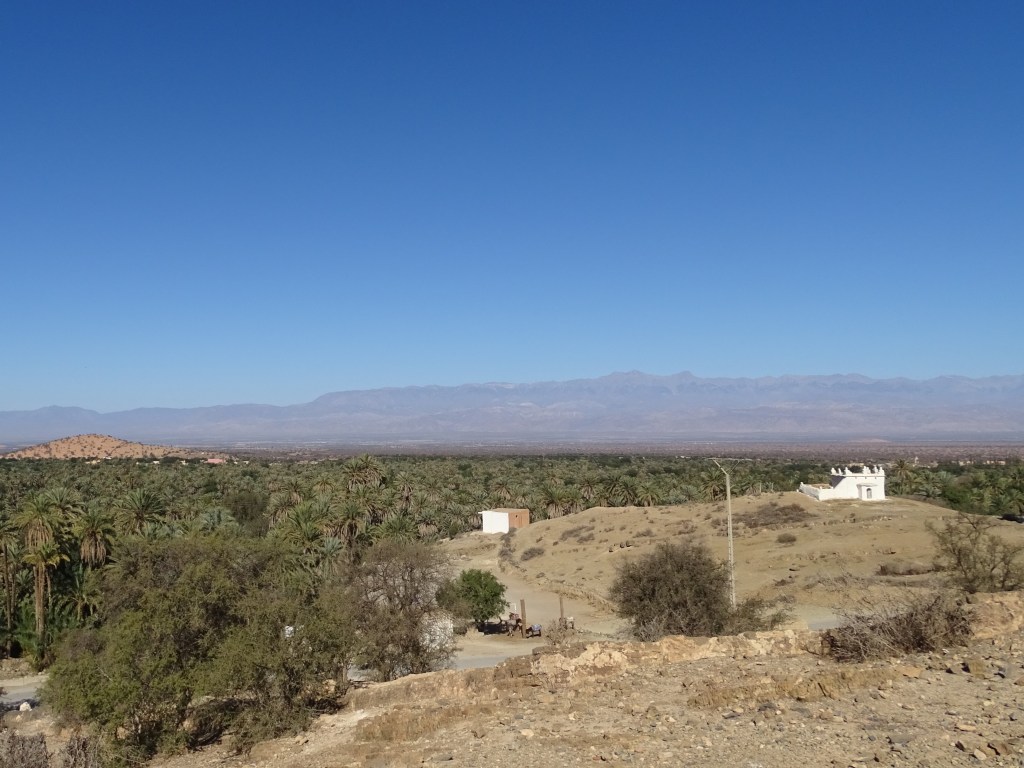 Standing on the rocky slope beneath the kasbah’s ruins, I can see a lush forest of palm trees below, the Atlas mountains beyond, and above, a sky so blue it’s as if the ocean is overhead. On a hill nearby is a small, whitewashed building that I recognise as a marabout – the tomb of a local saint. Maybe I should explore this extraordinary vista further, but the sole of one of my boots has started to come off. It flaps about as if I’ve unexplicably decided to tape a dying fish to my foot as I walk back down the hill.