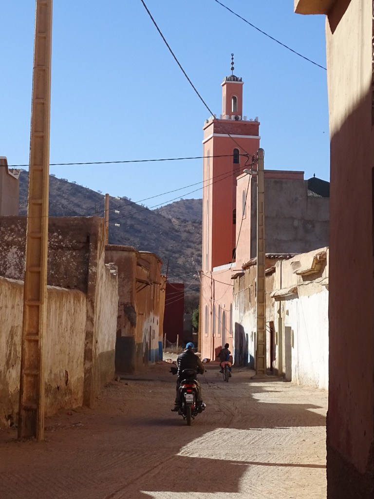 And scenic it is. We travel through canyons of red-rock cliffs, towering over palm trees. I keep thinking that this barely seems to be a place for mammals, never mind humans. The vast, primal landscape seems more of a place for dinosaurs or dragons. But there are humans, in villages among the palm trees. These would be Shilha people, a local branch of Amazigh. I see a girl wearing a traditional headdress, medallions dangling on her forehead.