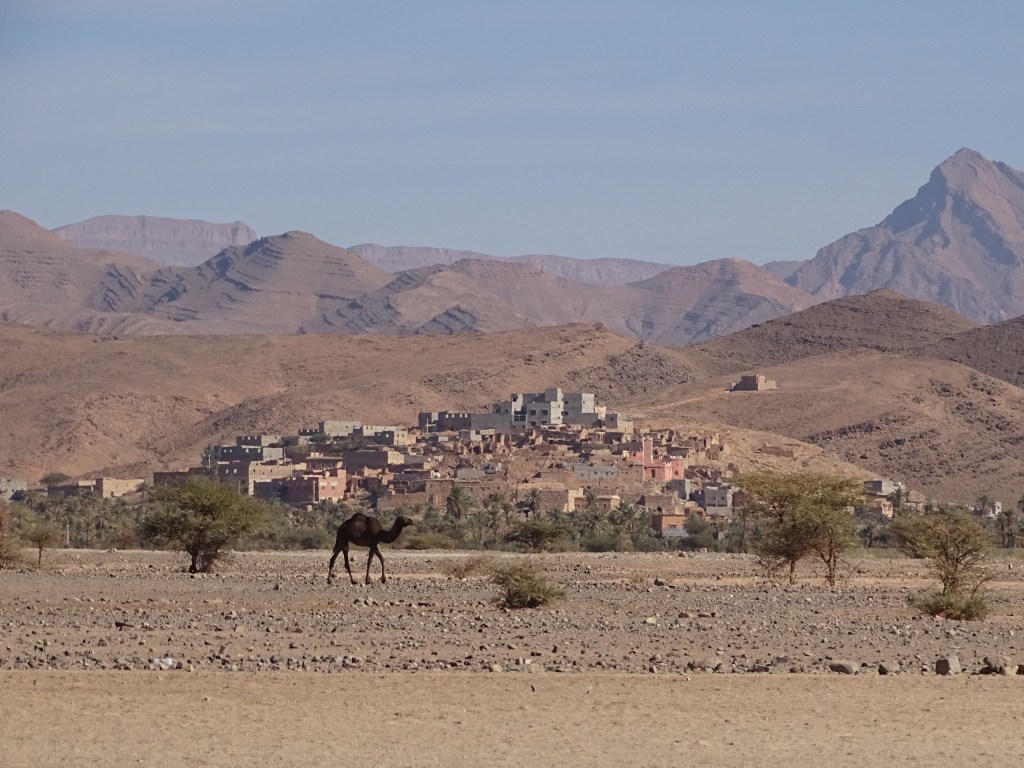 There are more camels ahead, including one defiantly blocking the road until they decide, in their own good time, to move out of the way. I can see a nomad’s striped tent at the foot of a mountain. This driver is taking a different route through the mountains to the one that took me to Tata, but it’s only slightly less impressive.