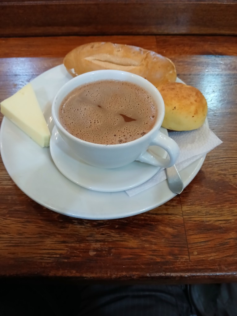 I am no good with cities. Never entirely certain how to make the best of them, I usually end up just wandering around. I suppose here I can look for Colombian cuisine. First, chocolate completo, a traditional Colombian breakfast or morning snack of hot chocolate, cheese, and bread, in La Candelaria, the main tourist district. It’s the tourist district because it’s the old town quarter, but I struggle to see how it deserves it. The hallmarks of mass tourism – hotels and restaurants and people selling brightly-coloured tat – are plastered over streets of low, tile-roofed buildings that are noticeably run-down.