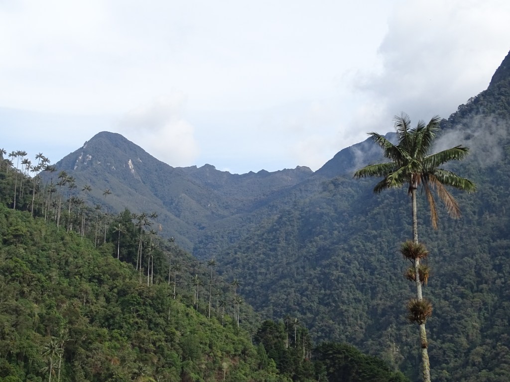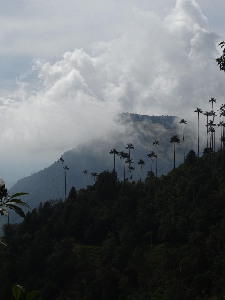 Finally past the worst of it, the trail starts sloping gently downwards out of the forest, which is gradually replaced by fields undulating over the slopes. Wax palms, their absurdly long trunks ending in shocks of fronds, become more and more common. As my surroundings become more tame and human-friendly, I start coming across broad wooden platforms for appreciating the views across the valley, including one occupied by a very bored-looking man running a snack stall playing pounding techno.